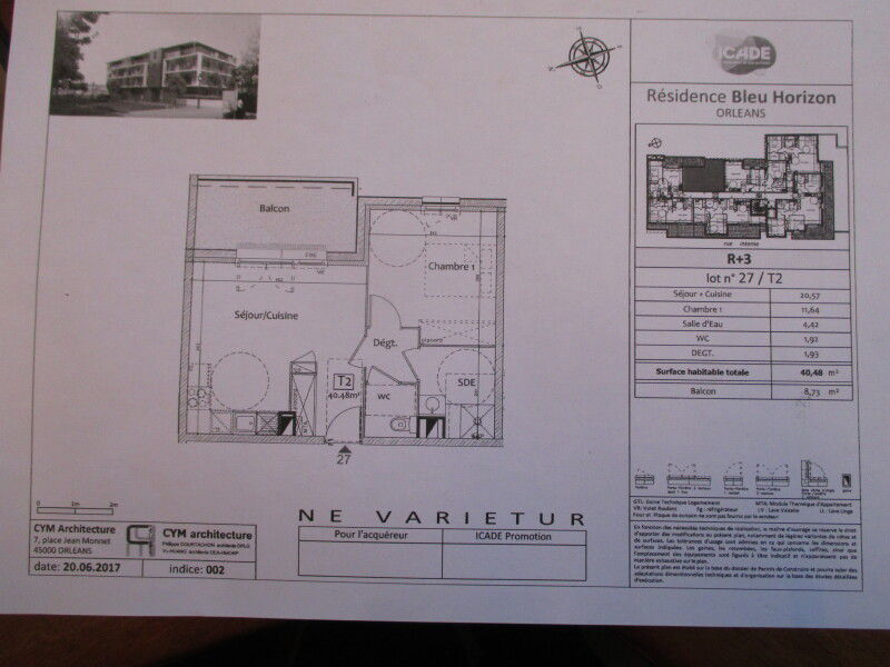 ORLEANS QUARTIER DUNOIS, résidence de 2019, F2 exposé Sud/Est et comprenant une entrée avec placard, 1cuisine aménagée et équipée (plaque de cuisson et hotte) ouverte sur le séjour, 1 balcon 1 chambre salle d'eau et des wc séparés. 1 place de parking en sous sol