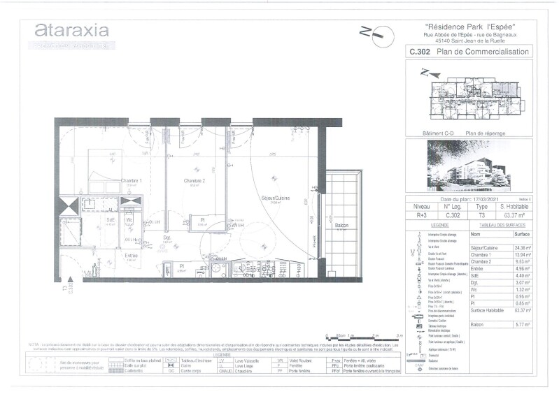 SAINT JEAN DE LA RUELLE Appartement T3 dans une résidence récente au coeur du centre-ville comprenant : une entrée , un séjour de 24m2 avec une cuisine ouverte aménagée et équipée (plaques de cuisson et hotte), un beau balcon, deux chambres, une salle d'eau, un wc séparé. Deux places de parking en sous-sol sécurisées. A proximité des commerces et des transports en commun.